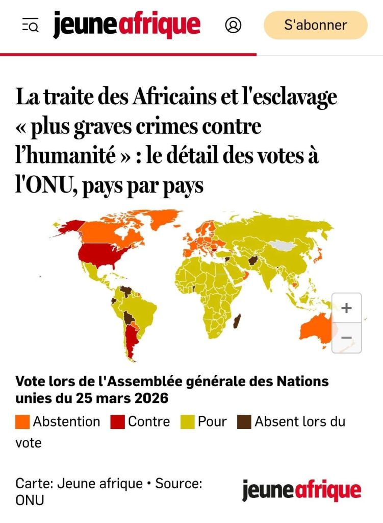—-Le 25 mars 2026, les Nations unies, par une déclaration solennelle de son assemblée générale (AG/12755), adoptent une résolution historique : celle qualifiant l’esclavage et la traite transatlantique des esclaves africains de «plus grave crime contre l’humanité ». (cf. lien n°1). Cette résolution a été votée sous l’impulsion du président du Ghana John Dramani Mahama avec l’appui de l’Union africaine.