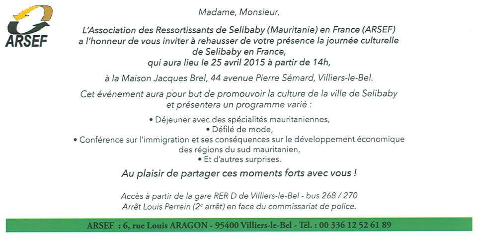 L’ARSEF ( Association des ressortissants de Sélibaby en France) vous convie à son événement culturel prévu le 25 Avril 2015.