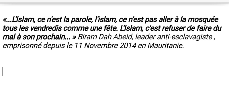 «…L’Islam, ce n’est la parole, l’islam, ce n’est pas aller à la mosquée tous les vendredis comme une fête. L’Islam, c’est refuser de faire du mal à son prochain… » Biram DahAbeid, président du mouvement abolitionniste IRA-MAURITANIE, Prix onusien 2013 pour son engagement et actuellement en prison avec son vice-président Brahim Bilal Ramdhane depuis le 11/11/2014.