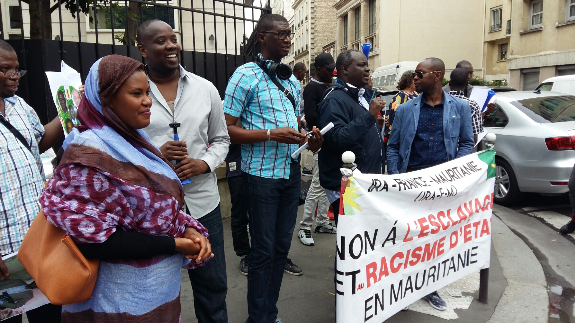 Ce jour d’été dans le chic quartier du 16 ème arrondissement de Paris, certains engagés pour le respect des droits humains en Mauritanie se sont réunis devant la représentation de la Mauritanie en France. Ce 3 août 2016, s’ouvre à Nouakchott le procès des plusieurs piliers du mouvement abolitionniste et anti-esclavagiste IRA-MAURITANIE. Le but du sit-in organisé par IRA-France auquel ont pris part plusieurs militants engagés, était d’alerter les autorités françaises et toutes les organisations sensibles au respect des droits humains, sur les arrestations arbitraires et le procès manipulé en préparation. En plus des éléments d’IRA-France en verve contre ces injustices , il faut noter la présence de certains cadors de la diaspora mauritanienne France, en la personne du grand pèlerin de la bonne cause et l’historique Ibnou Diagana de l’OCVIDH, de Madame Mariem Kane, de Mr Kaw Touré et MrHamadi Soh des FPC ex-Flam, de l’infatigable Diabé Ndiaye dit Thomas Mag et d’autres irréductibles. Des slogans habituels ont été brandis contre le régime répressif qui sévit dans le pays. Les kidnappings qui ont touché les leaders abolitionnistes d’IRA ( Initiative pour la Résurgence Abolitionniste ) à partir du 29 juin dernier, ont été dénoncés avec vigueur. Une déclaration a été éditée et distribuée aux passants, et un exemplaire sera déposé au courrier de l’ambassade.