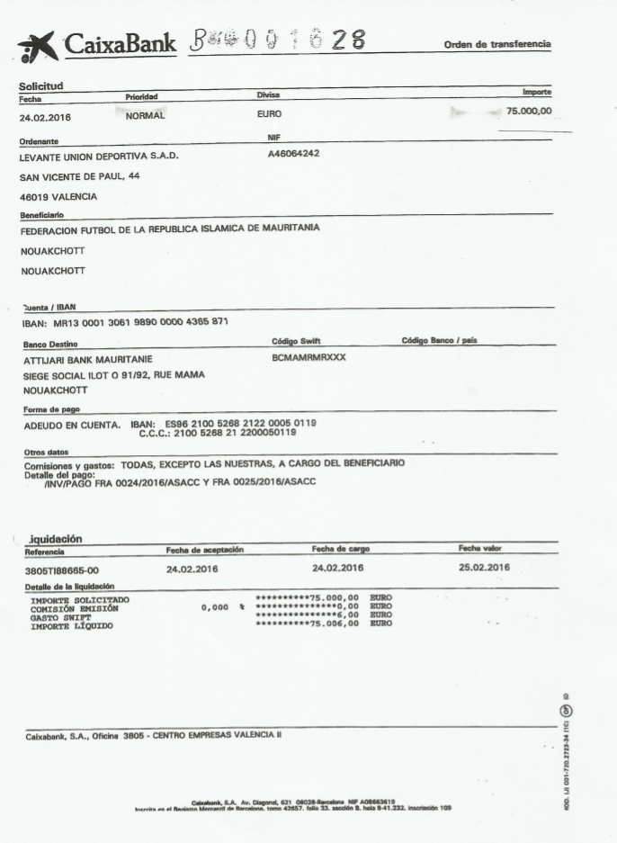 Voici la preuve du virement bancaire de la somme de 75000€ effectué le 24 Février 2016 par le Club espagnol LEVANTE sur un compte ouvert par la Fédération mauritanienne de football, suite au transfert d’El Hacen El ID et Aly Abeid de l’ASAC Concorde à Levante en Espagne. Fédération mauritanienne de Football (FFRIM) a t-il le droit de recevoir le montant du transfert de Hacen et Aly sur son compte ?.Selon nos informations , la FFRIM aurait produits des fausses factures , ouvert un compte bancaire de façon opaque avec la complicité d’un membre influent exclu par la direction de Concorde pour ouvrir ce compte bancaire auprès de la banque marocaine « Attijariwafa Bank » afin de détourner les fonds. Le club de Concorde demande son argent auprès du club espagnol après plusieurs relances auprès de la fédération mauritanienne de foot , Levante aurait porté plainte auprès du tribunal de Valence contre le président de la FFRIM, Ahmed Ould Yahya et la FFRIM pour détournement de fonds,trafic d’influence et corruption….
