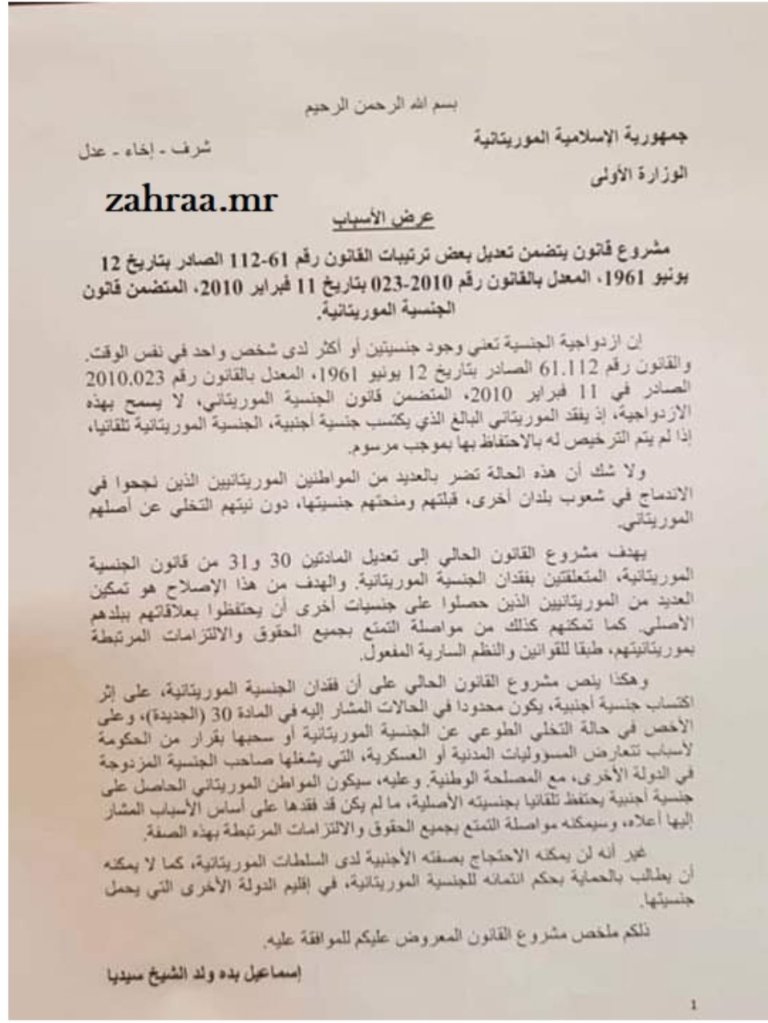 Un nouveau projet de loi a été élaboré par le premier ministère mauritanien, en faveur des détenteurs de plusieurs nationalités. Le nouveau projet comprend des propositions de modification de la loi sur la nationalité, en particulier les articles 30 et 31 de la loi sur la nationalité mauritanienne. Le projet de loi affirme que la double nationalité signifie avoir deux nationalités ou plus pour une même personne en même temps. Or, la loi n ° 61 112 du 12 juin 1961 modifiée par la loi n ° 2010 023 du 11 février 2010, sur la nationalité mauritanienne, ne permet pas cette duplication, car , l’ adulte mauritanien qui acquiert une nationalité étrangère perd automatiquement la nationalité mauritanienne s’il n’est pas autorisé à la conserver par décret. Le nouveau projet de loi considère que cette situation nuit à de nombreux citoyens mauritaniens qui ont réussi à s’intégrer dans les peuples d’autres pays, qui les ont acceptés et leur ont accordé leur nationalité sans qu’ils aient l’intention de renoncer à leur origine mauritanienne. La nouvelle loi vise à modifier les articles (30 et 31) de la loi sur la nationalité mauritanienne , dans le but de permettre à de nombreux Mauritaniens ayant acquis d’autres nationalités de maintenir leurs relations avec leur pays d’origine, et de pouvoir continuer à jouir de tous les droits et obligations liés à leur Mauritanité, conformément à la loi et à la réglementation Effet.