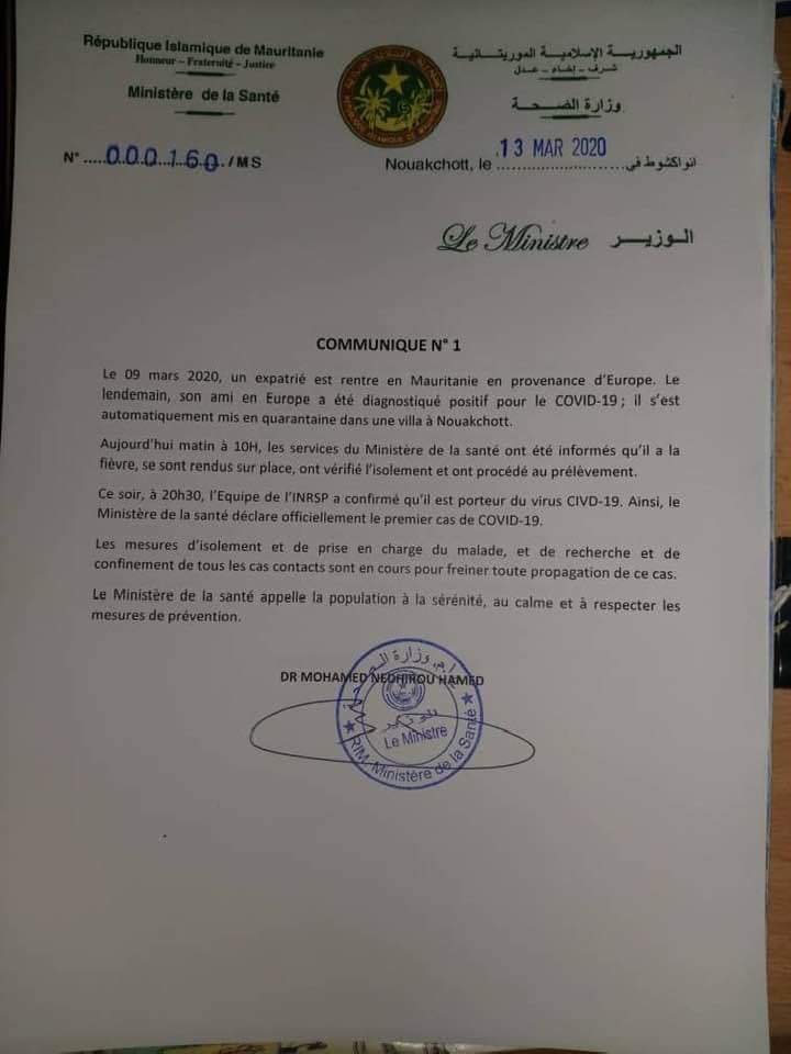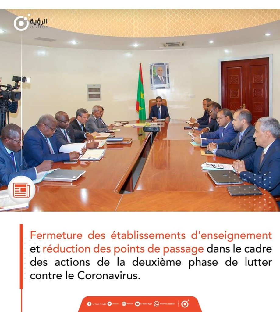 « Le Premier ministre, M. Ismail Bedda Cheikh Sidiya, a présidé, samedi matin, une réunion du Comité interministériel chargé du suivi de l’évolution du coronavirus (COVID-19). Le comité a examiné la situation de propagation du virus, surtout après la constatation du 1er cas du virus en Mauritanie et sa récente proclamation par l’OMS « pandémie« . A cette occasion, le comité a passé en revue les mesures rapides prises par les services sanitaires spécialisés immédiatement après l’annonce de l’apparition des symptômes de la maladie, vendredi, chez un ressortissant étranger et sa confirmation ‘’positif ‘’ à l’issue des analyses médicales.. A cet effet les différents services sanitaires spécialisés exercent les investigations approfondies sur les conditions d’entrée du sujet atteint au pays et l’identification des personnes avec lesquelles il a eu des contacts aussi bien dans l’avion qu’après son arrivée à Nouakchott pour prendre toutes les dispositions susceptibles d’empêcher la propagation du virus. Suite à cette situation, le gouvernement a décidé, dans le cadre de la seconde phase de la stratégie nationale de lutte contre la pandémie, stratégie tracée par le gouvernement, en application des instructions du Président de la République, M. Mohamed Ould Cheikh El Ghazouani, la prise d’une série de mesures qui seront immédiatement mises en vigueur :