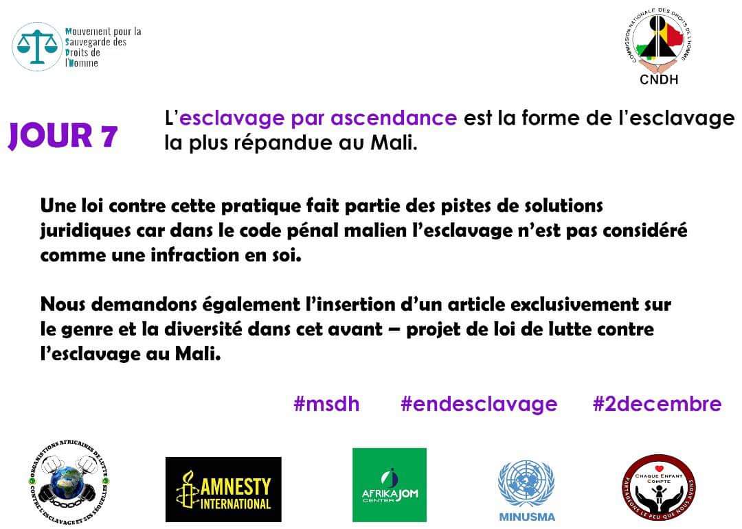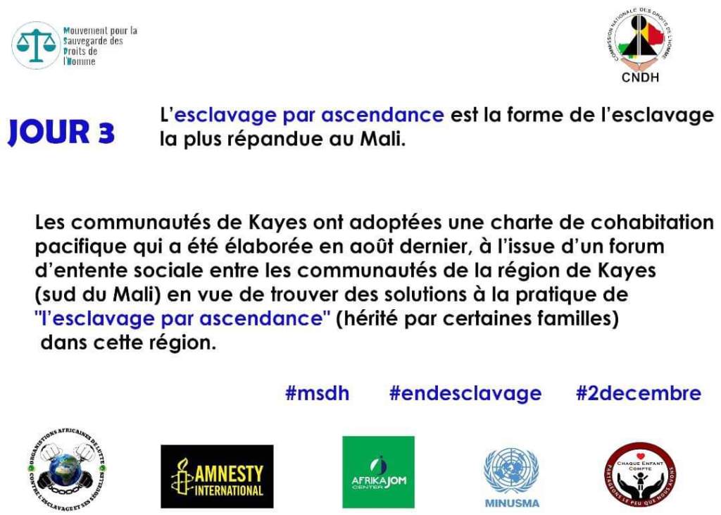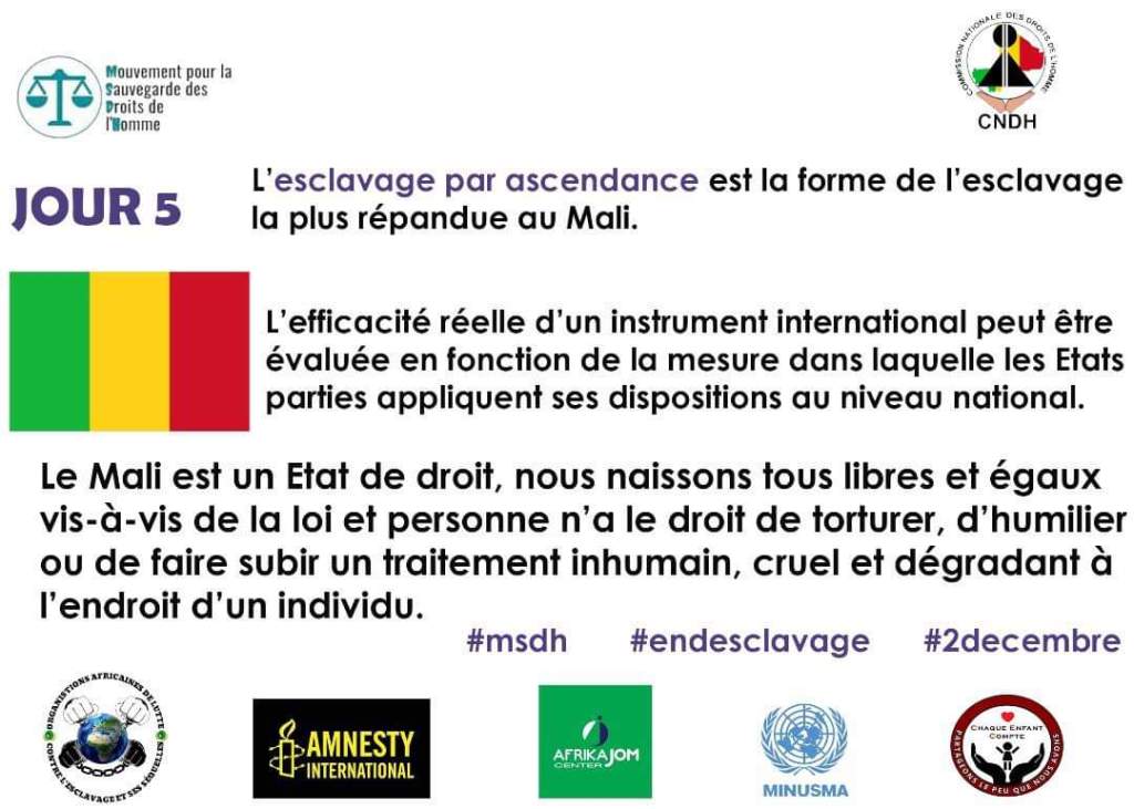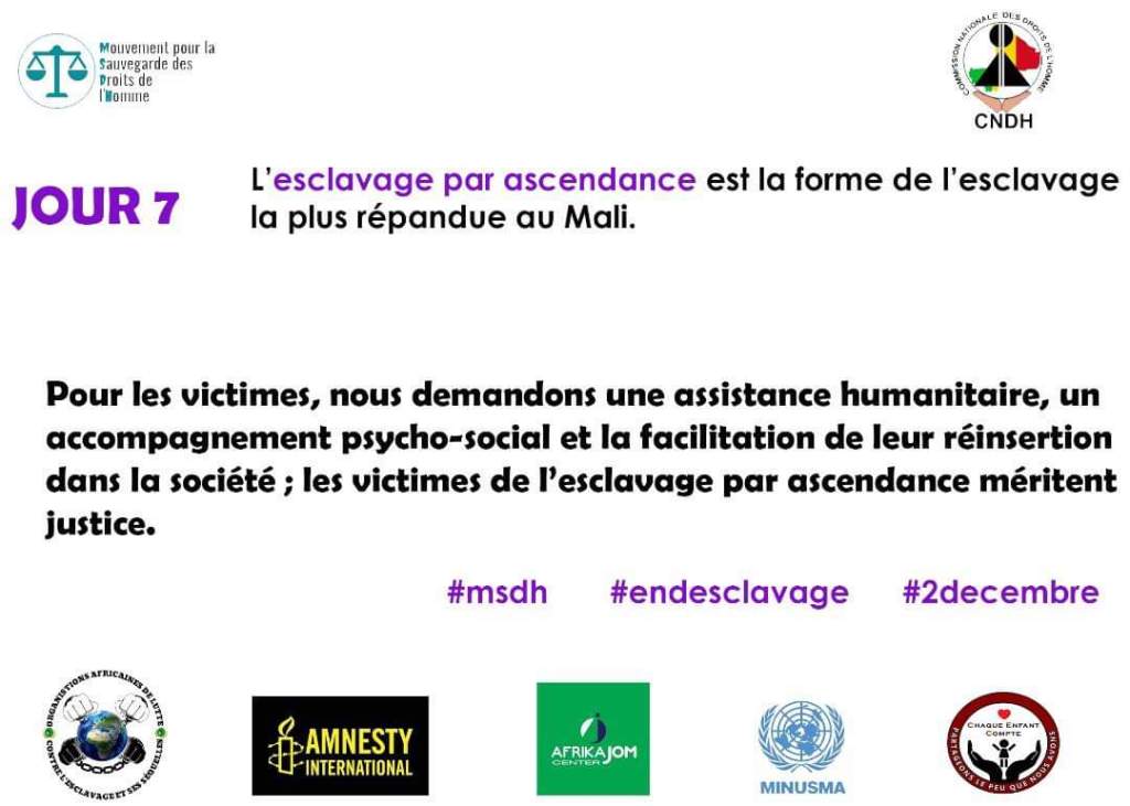 🔴 Nous rappelons que le Mali a ratifié la majorité des instruments juridiques (traités et conventions) régionaux, sous régionaux et internationaux relatifs aux droits humains, qui condamnent fermement l’esclavage et qu’il ne peut y avoir de paix tant qu’ils ne sont pas appliqués dans les normes afin de mettre fin à cette pratique. #msdh #endesclavage #2decembre