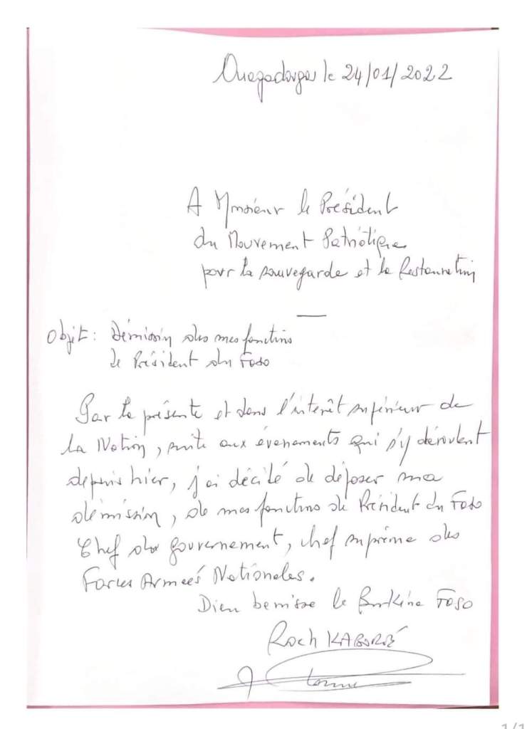 Fin d’épilogue ce 24 janvier 2022, le président du Faso Roch Marc Christian Kaboré a été évincé du pouvoir par un coup d’état militaire. Élu en novembre 2015 (réélu fin 2020), l’homme politique de 64 ans ayant été premier ministre et président de l’Assemblée nationale burkinabé par le passé, a été déposé par une junte militaire dirigé par le Lieutenant-colonel Paul Henri Sandaogo DAMIBA âgé de 41 ans . Le nouvel homme fort du pays des hommes intègres, est à la tête du MPSR (Mouvement Patriotique pour la Sauvegarde et la Restauration). Ce soir un élément média d’une lettre manuscrite est diffusé à travers la page Facebook de la RTB donnant la démission signée par le président déchu, voir en lien https://www.facebook.com/298380080180122/posts/7285255031492557/ .