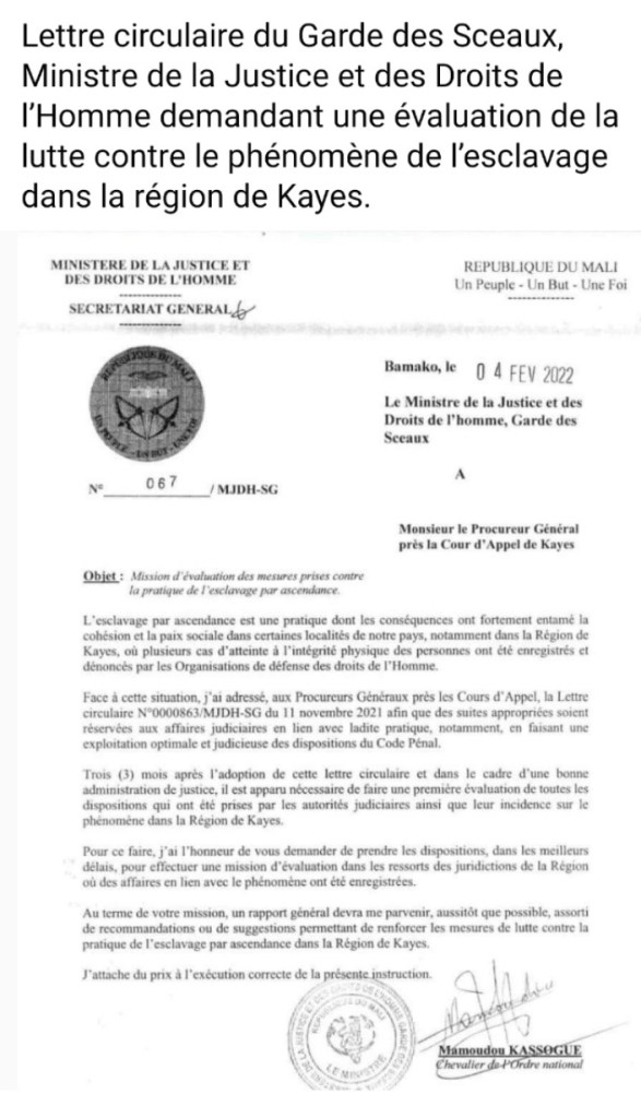 Par une note du ministère de la justice et des droits de l’homme, une évaluation est demandée auprès du Procureur général près la cour d’appel de Kayes sur les dernières mesures du gouvernement malien contre le phénomène de l’esclavage par ascendance. Cette injonction ministérielle signée le 4 février, a été publiée ce 11 février 2022 sur la Page FB officielle du ministère de la justice voir https://www.facebook.com/855449061193709/posts/7036223733116180/ .
