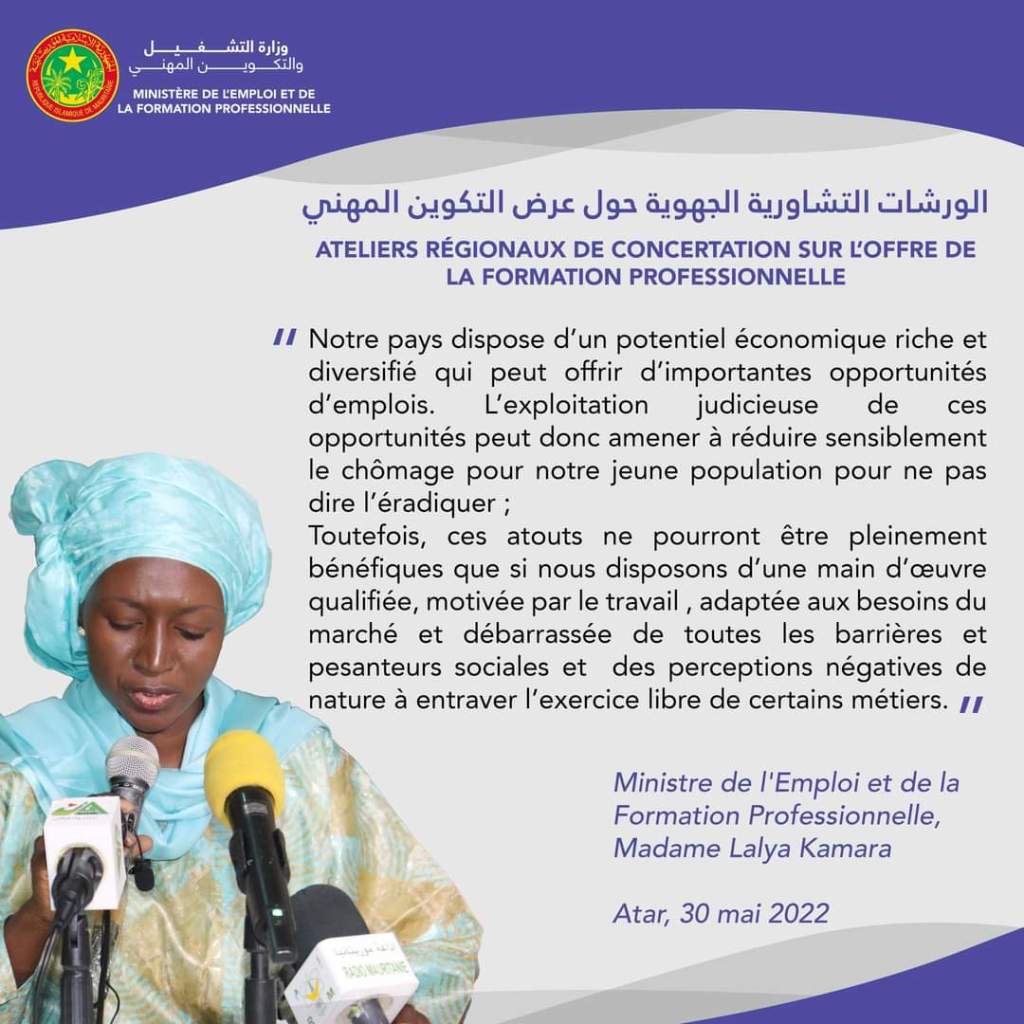 Discours intégral prononcé par la Ministre de l’Emploi et de la Formation Professionnelle, Madame Lalya Kamara, le lundi 30 mai 2022, à Atar, lors du lancement de l’atelier de concertation et d’échanges sur l’actualisation de l’offre de la formation professionnelle pour sa mise en adéquation avec la demande du marché de l’emploi, organisé par le Ministère de l’Emploi et de la Formation professionnelle.