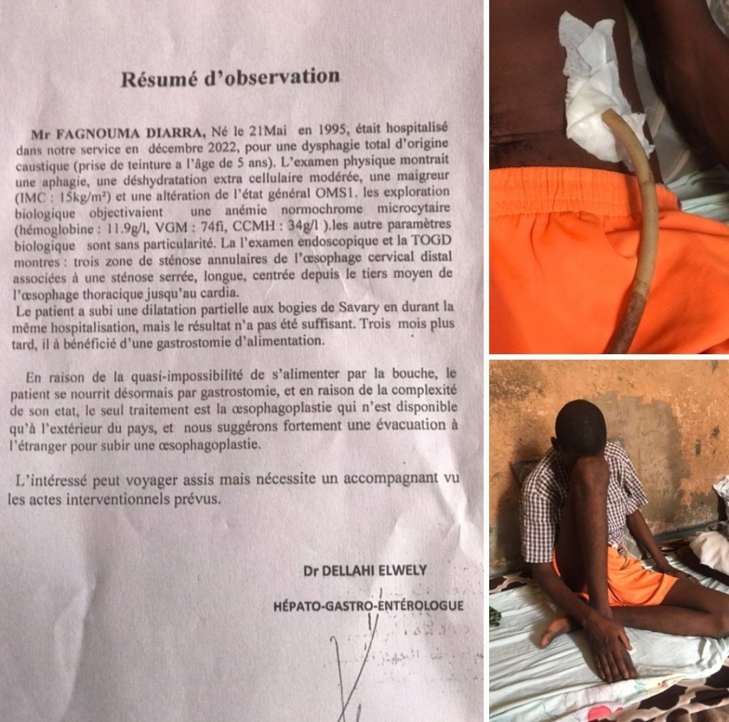 Nous souhaitons attirer votre attention sur le cas urgent de Fagnouma Diarra, né le 21 Mai 1995, qui a été hospitalisé dans le service de l’hôpital national de Nouakchott en décembre 2022. Fagnouma souffre d’une dysphagie totale d’origine caustique, qui est le résultat de l’ingestion d’une teinture à l’âge de 5 ans. Son état est extrêmement grave, et nous sollicitons votre soutien pour l’aider à obtenir le traitement dont il a désespérément besoin.