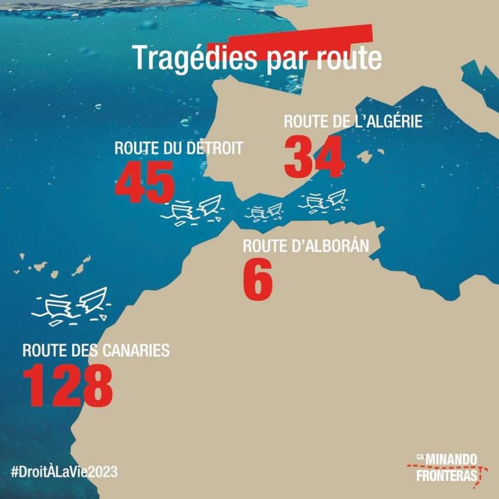 Ci-après l’élément média publié (10 janvier 2024) par l’activiste humanitaire espagnole Helena Maleno Garzón sur sa page Facebook https://m.facebook.com/story.php?story_fbid=pfbid02zeCyFqqttF1RWbRbtYkWLUdX3o5FKPoNZ9DQsAE7vnqxZ5q6X5GiheZA7Gn661B6l&id=100000669808011 . On y constate un chiffrage lourd sur l’année 2023 de la dramatique situation de l’immigration clandestine entre les côtes africaines (Nord et Ouest) et la rive européenne (principalement espagnole).