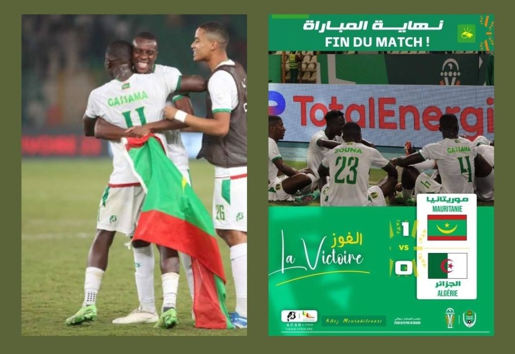 À Bouake (Côte d’Ivoire), ce mardi 23 janvier 2024 marque une journée historique dans les annales sportives mauritaniennes. À l’occasion d’un dernier match du groupe D, Nos Mourabitounes ont battu l’avant dernier champion d’Afrique les Fennecs d’Algérie et s’offrent une place de huitième de finaliste. Avec un score serré de 1 à 0, la Mauritanie fait un pas de géant en accédant au Top 16 de la CAN 2023 (reportée en 2024) chez le pays de Félix Houphouët Boigny et de Didier Drogba. Classés parmi les meilleurs 3èmes repêchables des poules, les coéquipiers du portier Babakar Niasse (élu homme du match du jour) vont affronter la tenace et montante équipe du Cap-Vert, lundi prochain 29 janvier 2024 à Abidjan à 18H (heure de Paris). Pour rappel la Mauritanie est à sa 3ème participation à la compétition faîtière du football africain sous l’égide de la Confédération Africaine de Football (la CAF). Lors de cette édition, les protégés du coach franco-comorien Amir Abdou ont concédé 2 défaites (face aux burkinabè 1-0 et aux angolais 3-2) et une victoire. Cette dernière contre les algériens assure un éclat d’engouement du côté de Nouakchott et ouvre une perspective d’une belle rencontre face à nos voisins insulaires dans l’océan Atlantique. À y aller sans regrets…pour que l’aventure continue… in sha Allah !