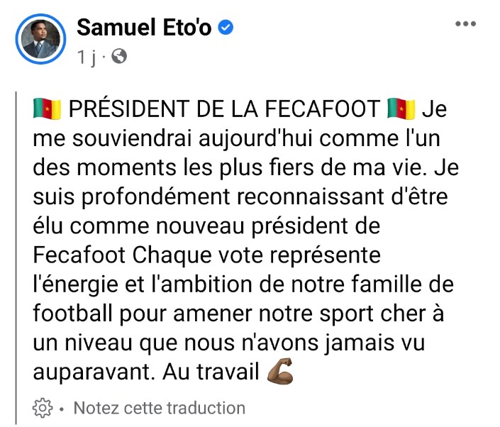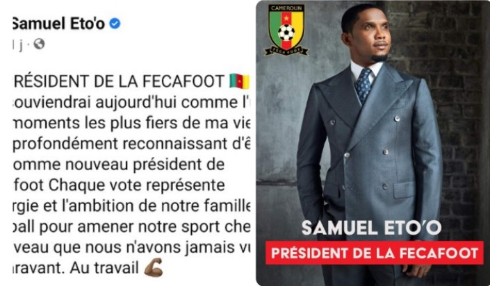L’ex enfant prodige du football camerounais et africain, Mr SamuelEto’o gagne avec brio l’élection de la présidence de la Fecafoot. La grande star buteur passé par quelques clubs cadors du football européen (Real Madrid, FC Barcelone, l’Inter Milan et Chelsea…), devient le 17 ème président de l’institution faîtière du foot de son pays.